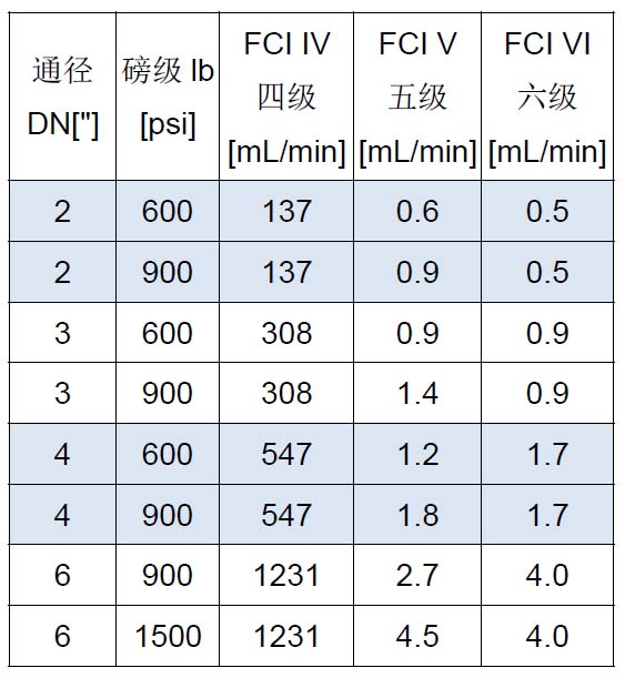 超低泄漏量   多路閥的泄漏量一般使用ANSI FCI 70-2標(biāo)準(zhǔn)來(lái)衡量,根據(jù)FCI 70-2標(biāo)準(zhǔn)的計(jì)算可以得到如下圖所示的不同型號(hào)多路閥四級(jí)(IV)、五級(jí)(V)、六級(jí)(VI)的允許泄漏量,可以看出四級(jí)的允許泄漏量比五級(jí)和六級(jí)多兩個(gè)量級(jí),差距非常大。其他廠家的多路閥只能達(dá)到FCI四級(jí)泄漏水平,而且隨著軟密封材料的快速磨損,在使用半年后泄漏量會(huì)嚴(yán)重超標(biāo),連四級(jí)都達(dá)不到,嚴(yán)重影響到客戶的正常使用。 但我公司的平面硬密封多路閥可以實(shí)現(xiàn)FCI五級(jí)(V)和六級(jí)(VI)的泄漏量,可以實(shí)現(xiàn)關(guān)斷閥的要求,性能遙遙領(lǐng)先國(guó)內(nèi)外其他廠家。